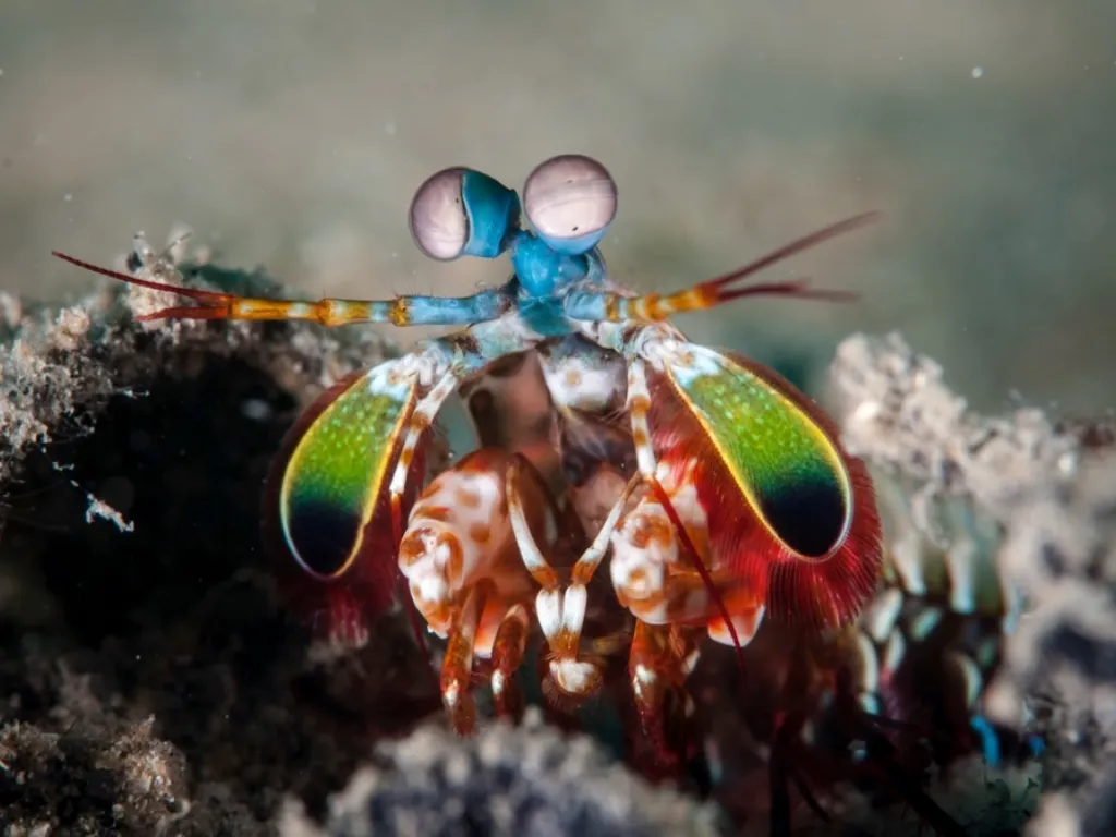 -Procesamiento rápido: Se cree que, en lugar de mezclar colores en el cerebro como hacemos nosotros, la langosta mantis detecta colores de forma casi instantánea, lo cual es vital para sus ataques ultra-rápidos en entornos marinos complejos.